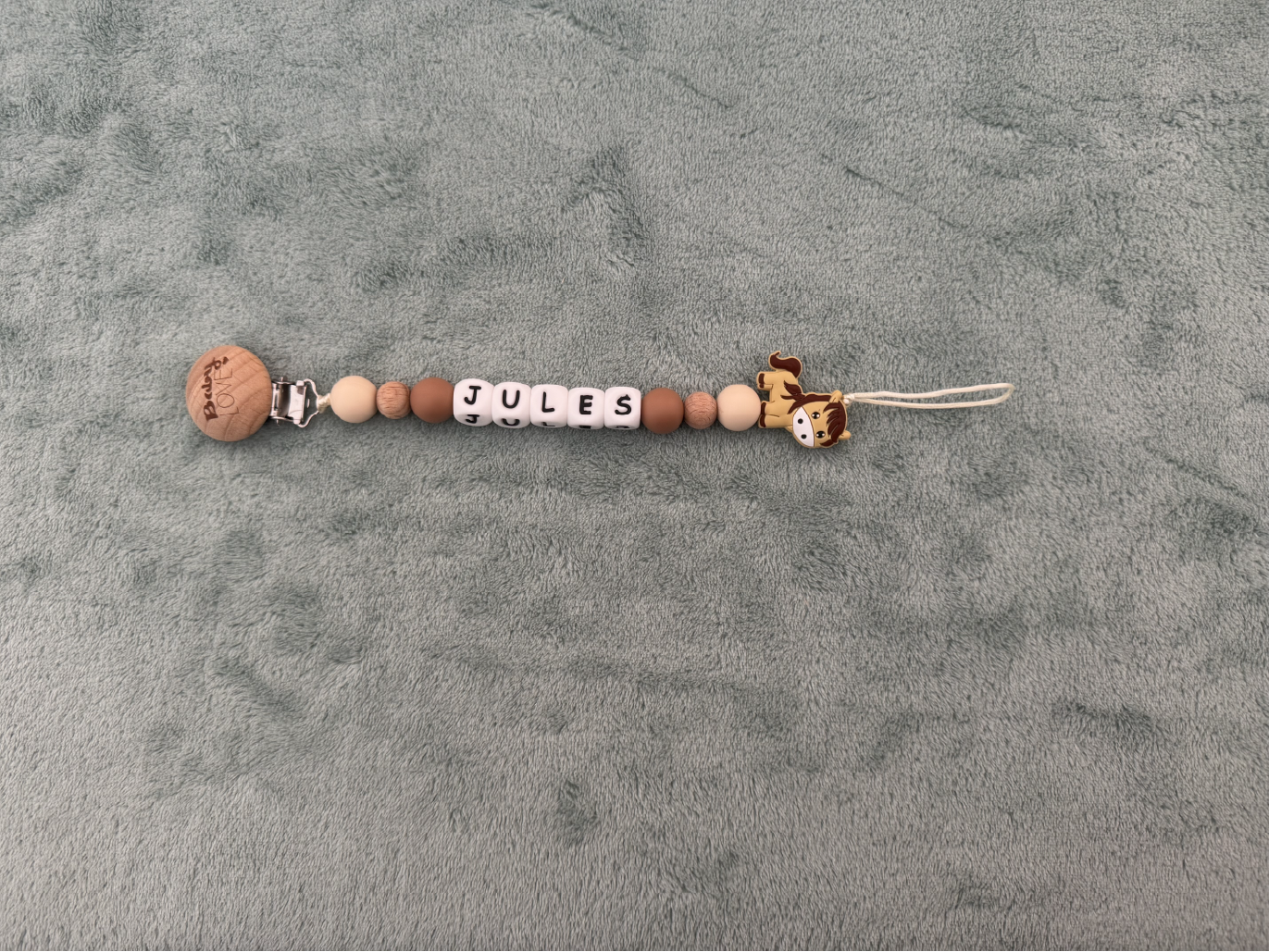 Choisissez les couleurs, le style et les détails pour créer une attache-tétine unique, entièrement faite à la main en Belgique.